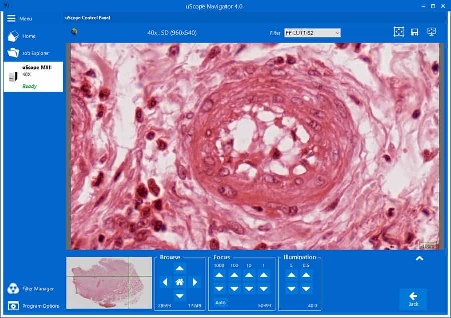 uScope Navigator gives you complete control over position, illumination, focus, and image filter settings.