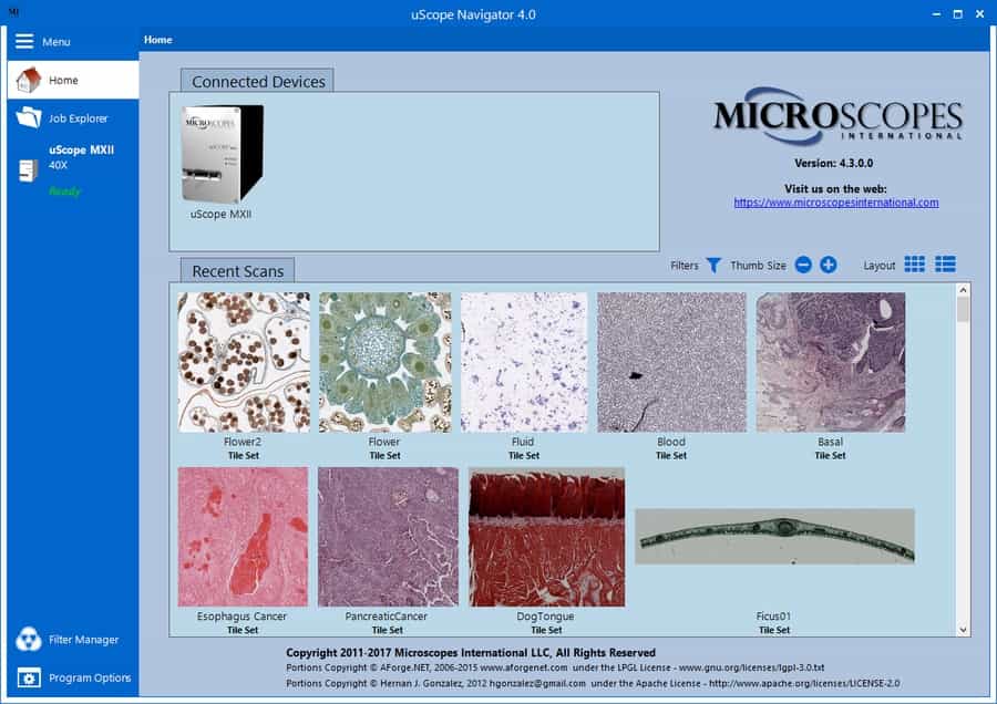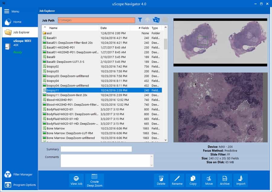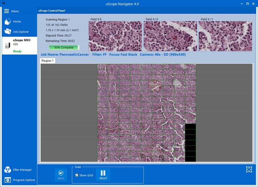 The uScope Navigator application lets you create jobs to scan regions of interest. Once you select the region of interest and initial focus, the Navigator application starts scanning your slide with the uScope Digital Microscope.