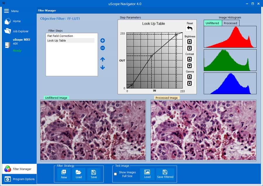 uScope Navigator enables you to apply image processing filters to the overview image, to the scanned fields in a region of interest, or to Deep Zoom Image Sets.