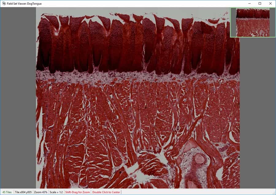 The uScope Navigator application offers two different ways to view your scans. You may view the individual fields tiled into a mosaic (the Tiled Image Viewer) or you may view them as a large, deep zoom image (the Deep Zoom Viewer) that uScope Navigator creates for you.
